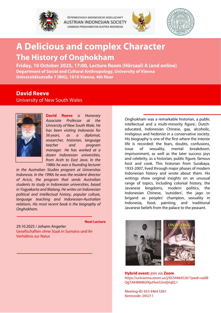 David Reeve is Honorary Associate Professor at the University of South Wales, Australia. He will speak about the Indonesian historian and writer Onghokham (1933-2017), a public figure with many identities.