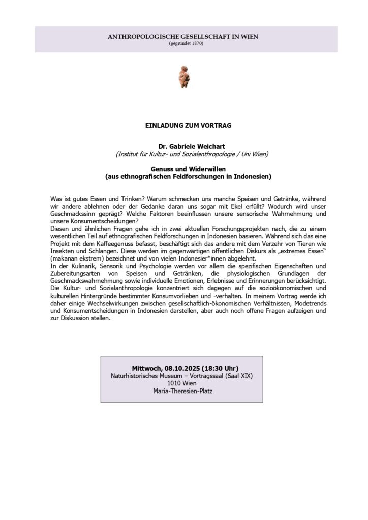 Gerne möchte ich an Sie die Einladung zum Vortrag unseres Beiratsmitglieds Dr. Gabriele Weichart weiterleiten, die am 8. Oktober zum Thema GENUSS UND WIDERWILLEN über Essenskulturen in Indonesien sprechen wird.