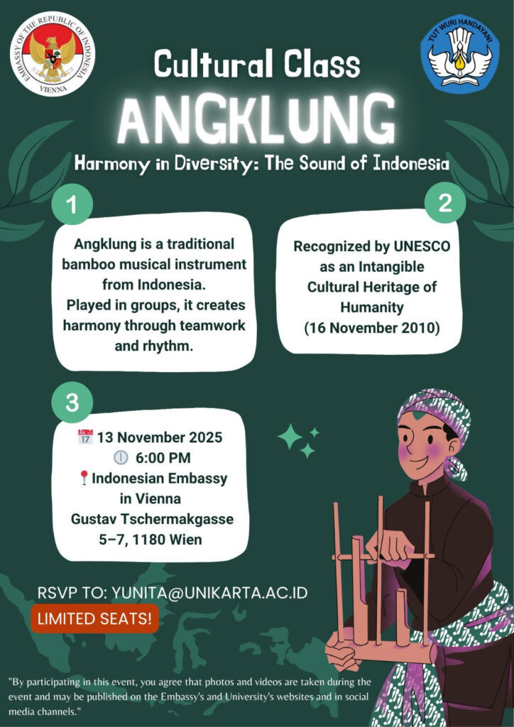 I have the pleasure to kindly invite you to tomorrow’s culture class at the Indonesian Embassy. You will have the opportunity to experience the unique sound of angklung, Indonesia’s famous musical instrument. Come and join, and don’t forget to register soon! Please also check the attached flyer.