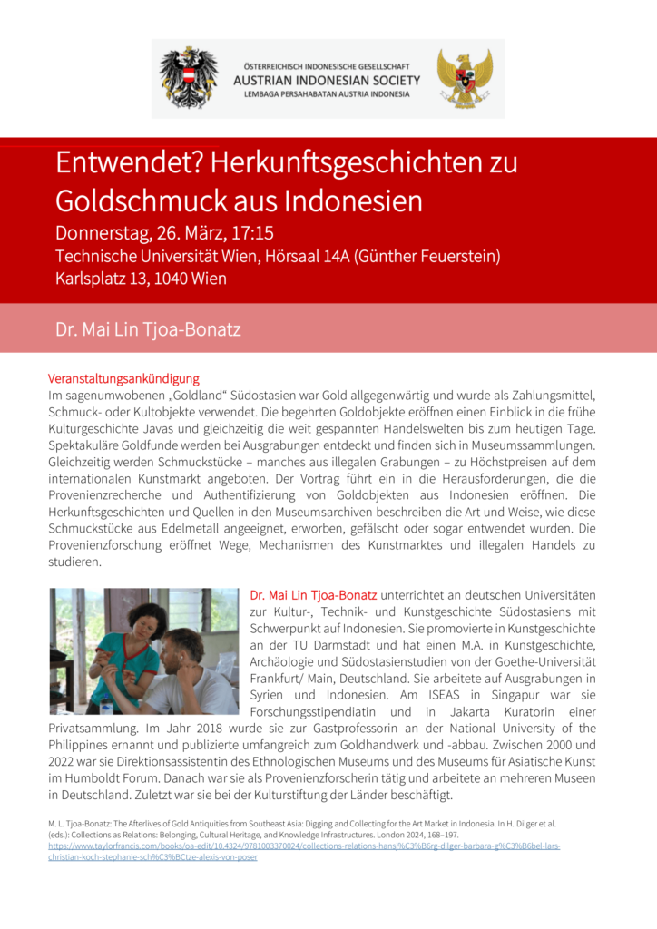 Dr. Mai Lin Tjoa-Bonatz, Berlin, wird zu dem Thema “Entwendet? Herkunftsgeschichten zu Goldschmuck aus Indonesien sprechen”.